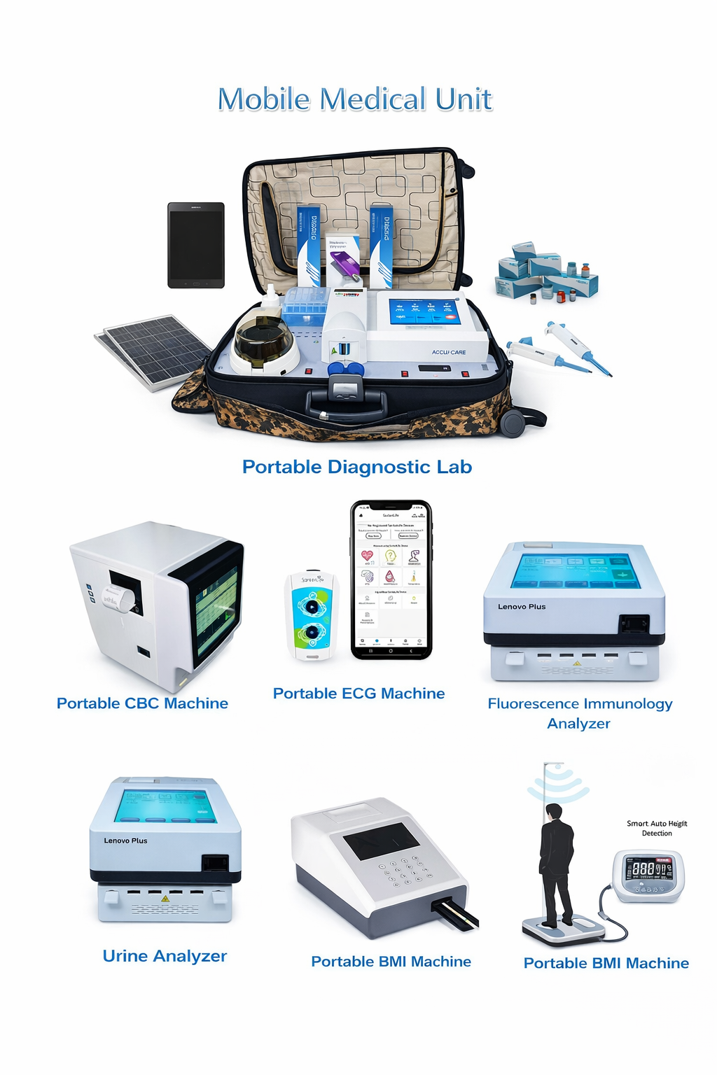 A complete point-of-care diagnostic solution integrating all major analyzers and vital parameters in a single portable setup, ideal for Mobile Medical Units, large CSR projects, and comprehensive healthcare delivery in remote and underserved areas.